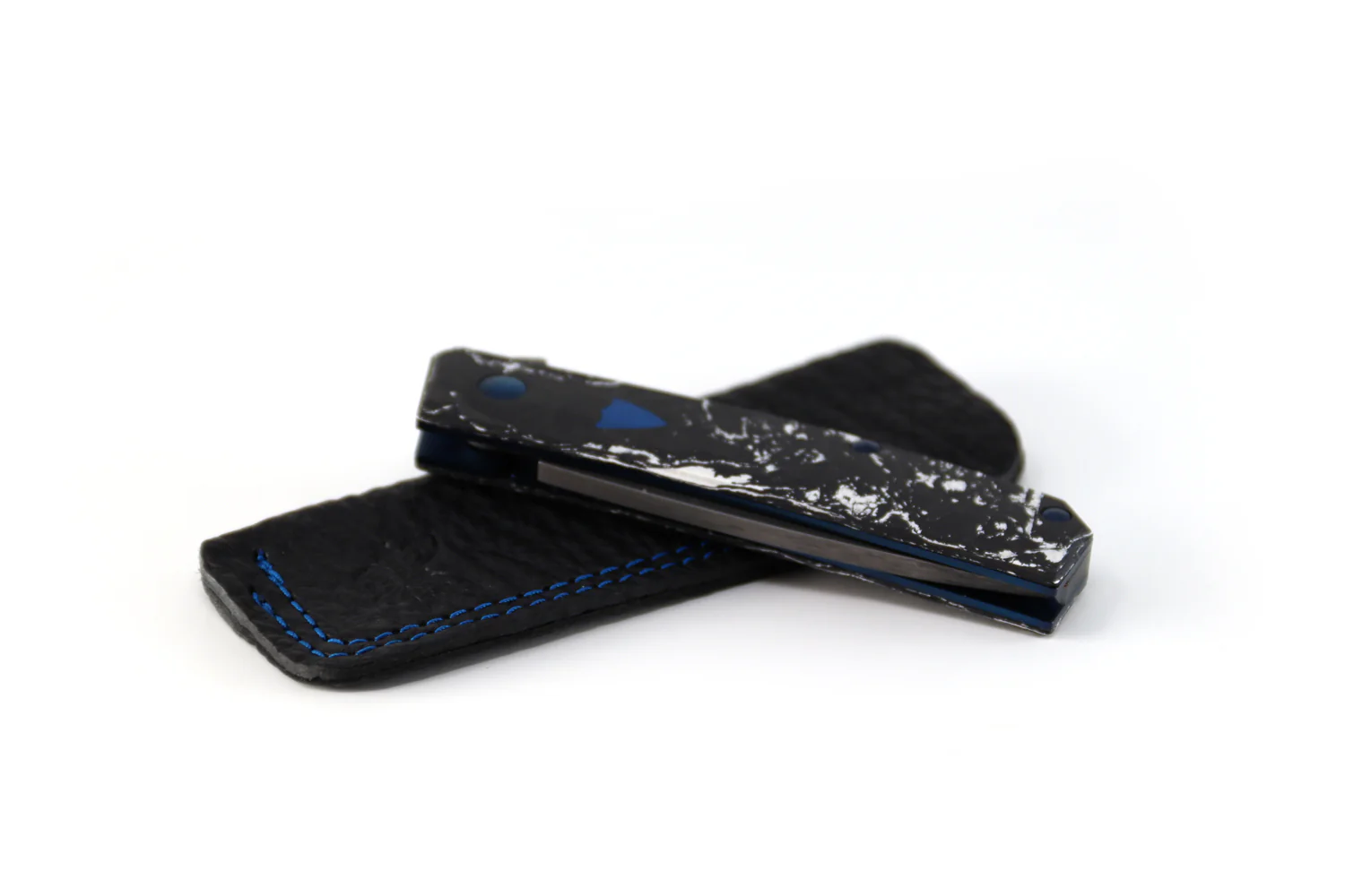 Hand Crafted by Benchmade's Best | Pushing the boundaries of production knifemaking, the new Unlimited Limited Gold Class 601-211 Tengu infuses jaw-dropping materials with the popular design of custom knifemaker, Jared Oeser. Employ the flipper tap to fire the Damasteel tanto blade into action; it's held in place with a liner lock. The marbled white and black carbon fiber handle and blue anodized hardware is eye-catching, strong, and nice in the hand. When not in use, place the knife in its shark skin leather sheath. Step up your game and feel the fire of true class with the new and limited Benchmade Tengu. Hand crafted by Benchmade’s best, this year’s Gold Class offering sets a new standard for American craftmanship.